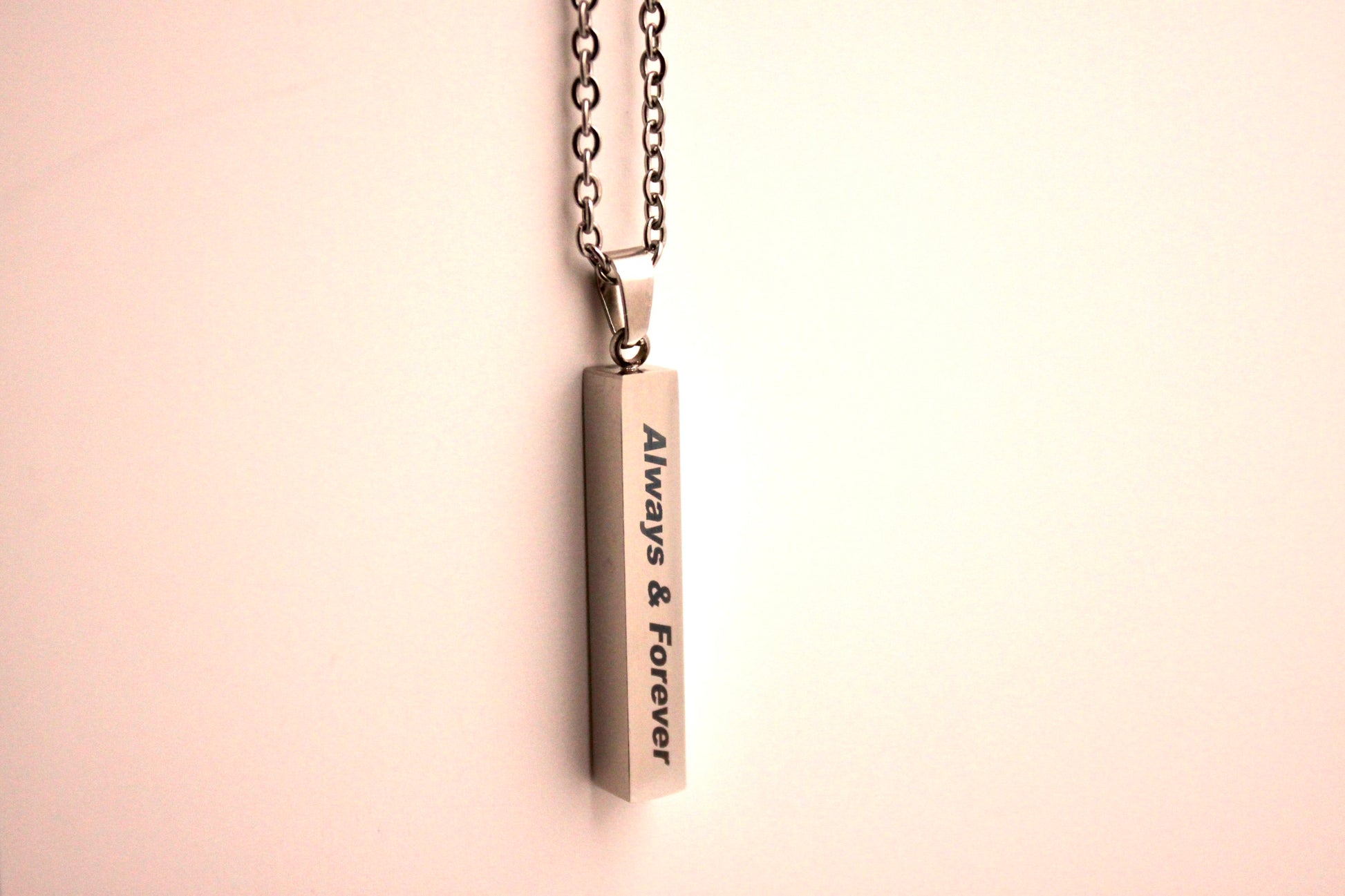 The Always & Forever Pendant Necklace is a simple yet meaningful accessory. This necklace features a pendant inscribed with "Always & Forever." It's crafted to symbolize enduring commitment. The product description is minimal, focusing solely on the name provided.